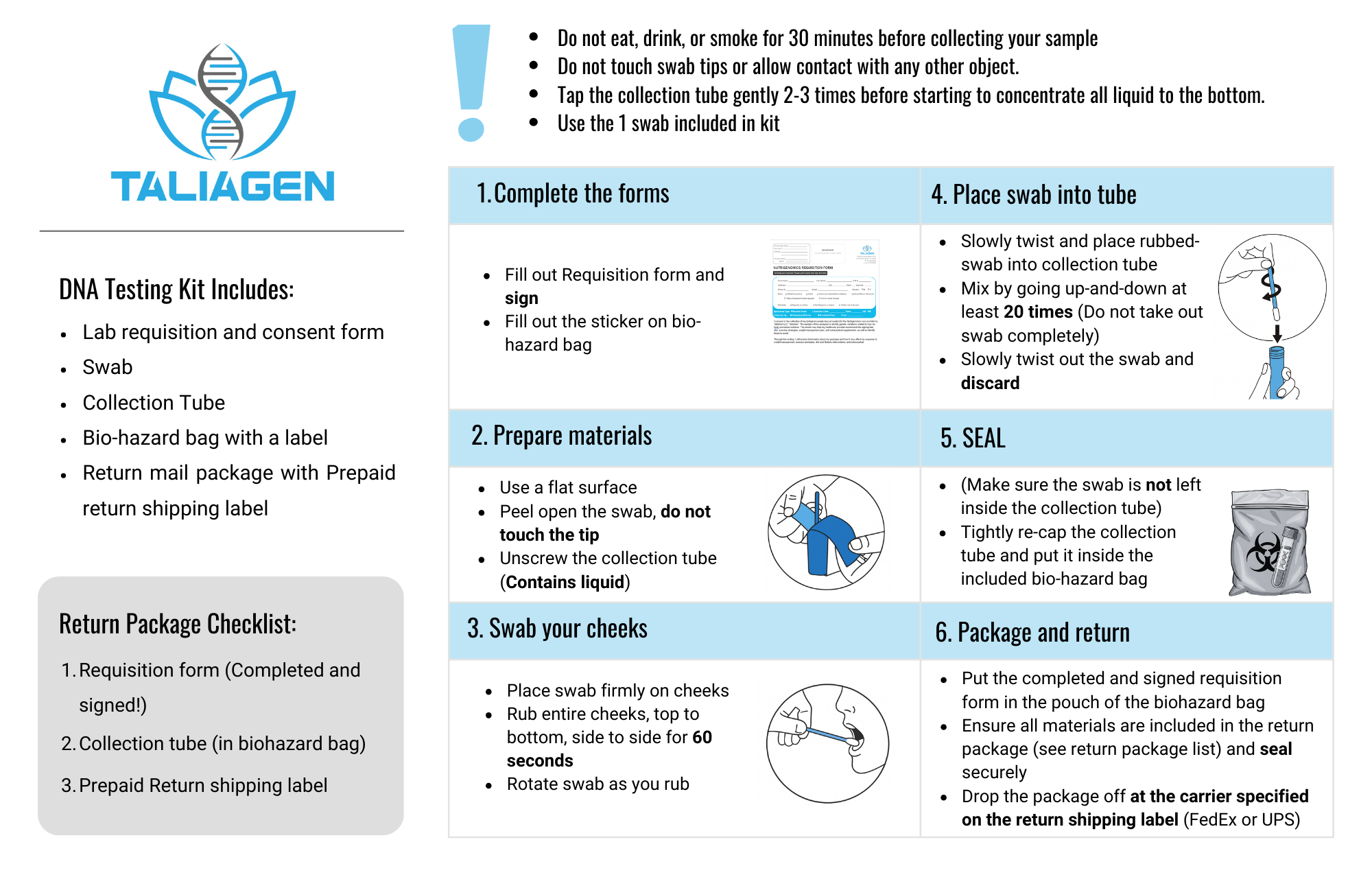 Collect a simple cheek sample at home. Ship it back to us using our prepaid express label.